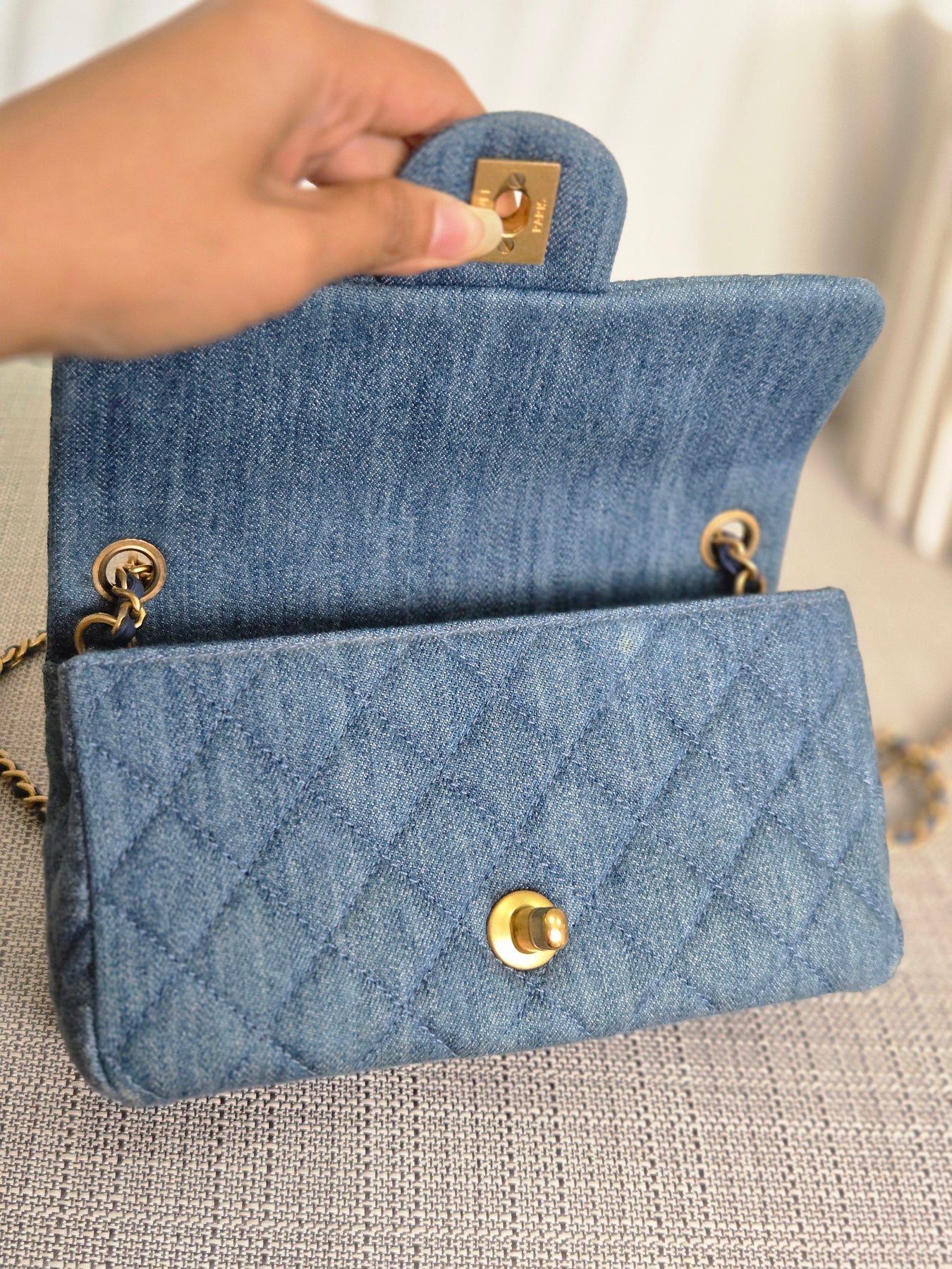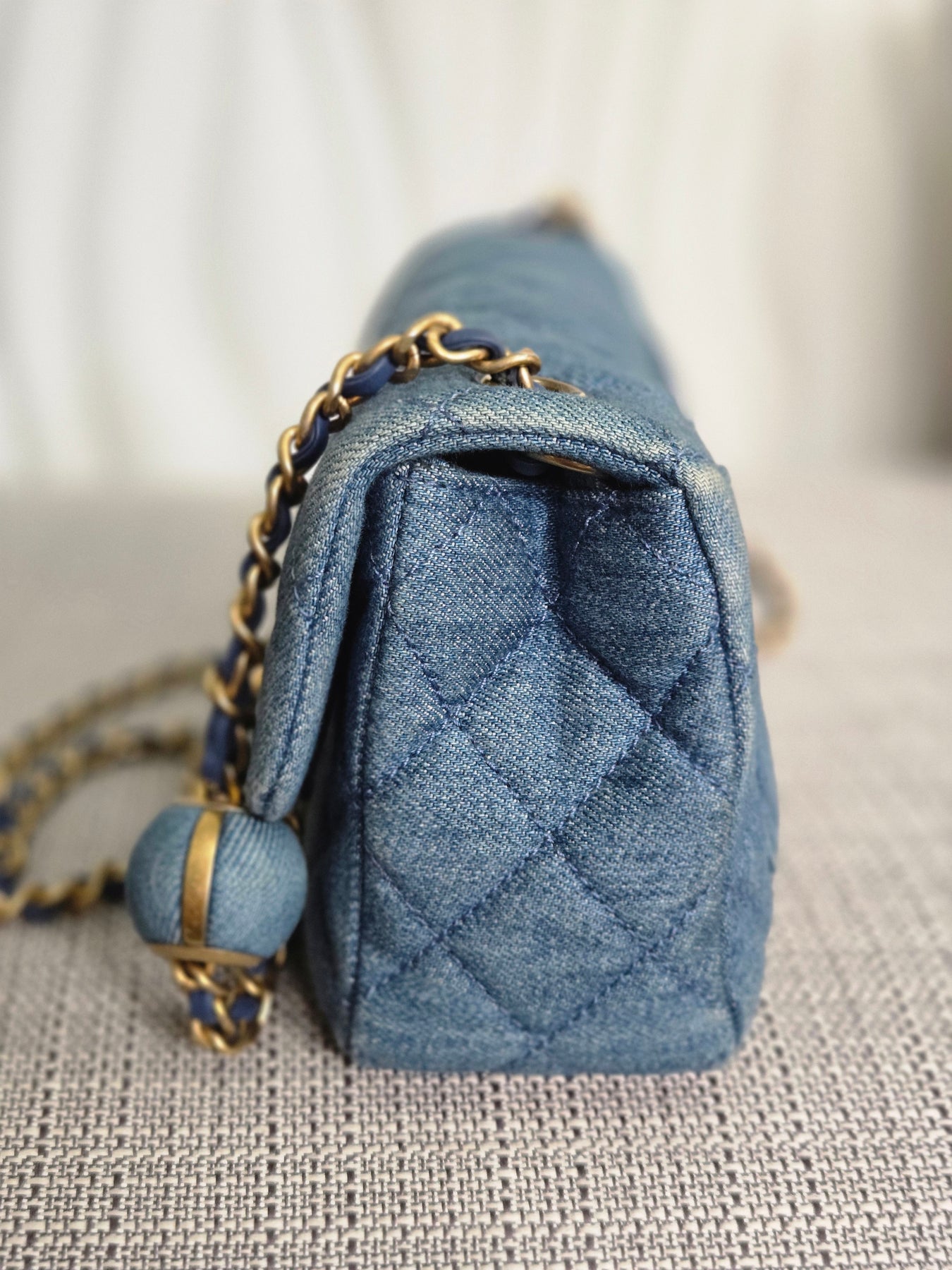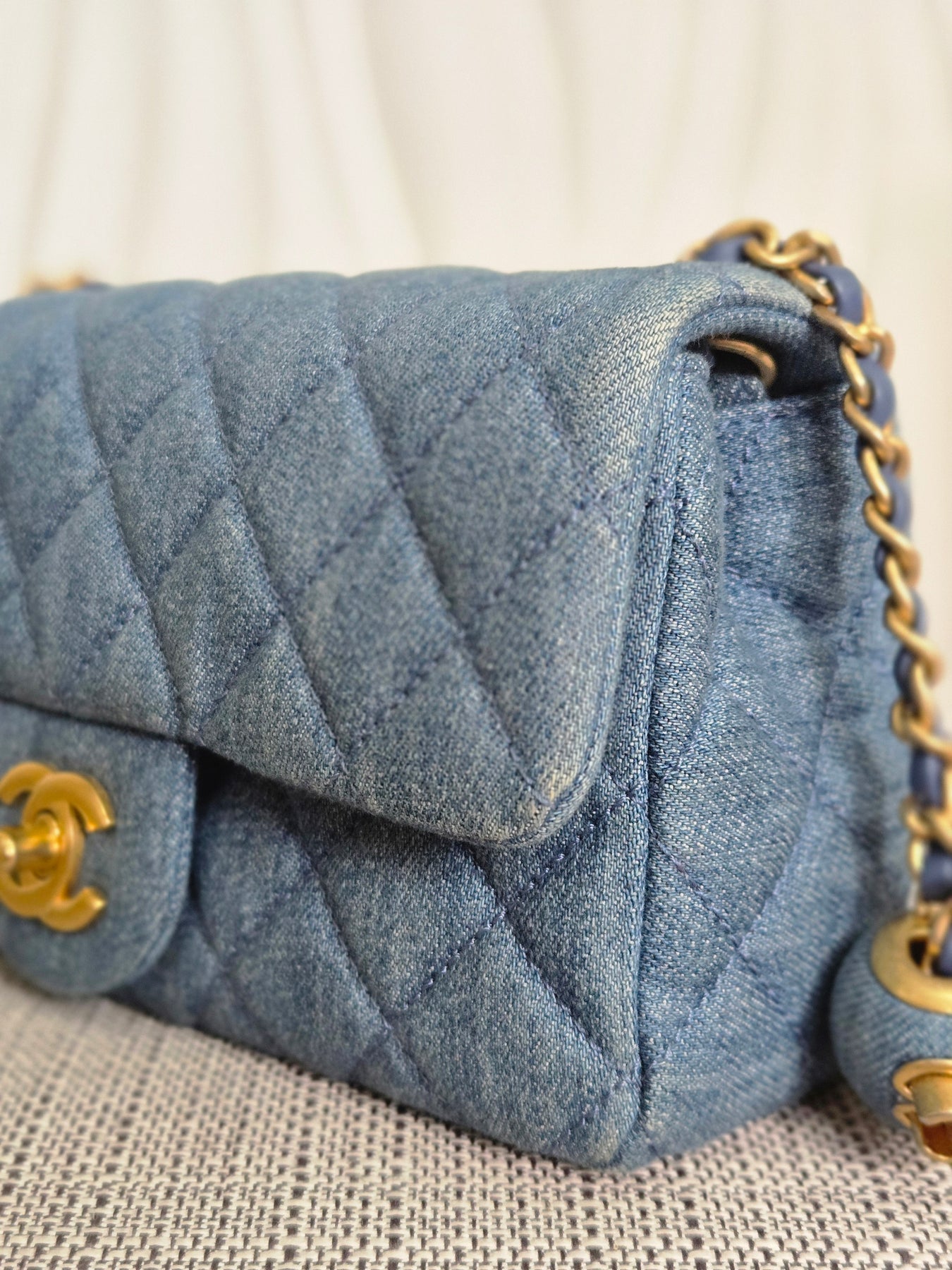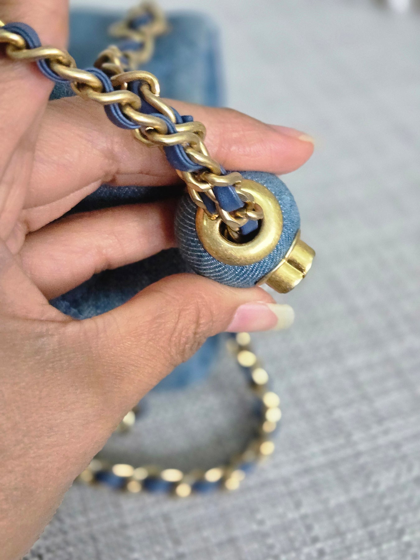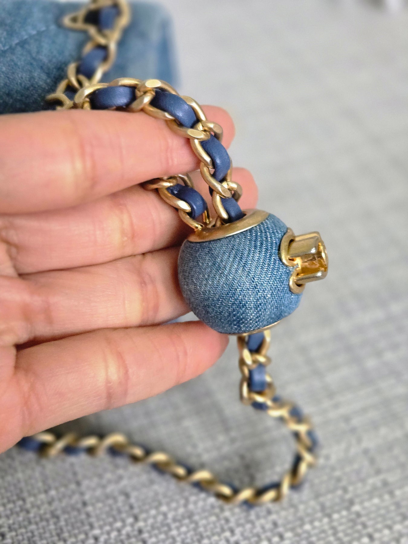 CHANEL 23C 2022/2023 Cruise collection Denim Pearl Crush Adjustable Chain Mini Rectangular Flap Bag with Aged GHW