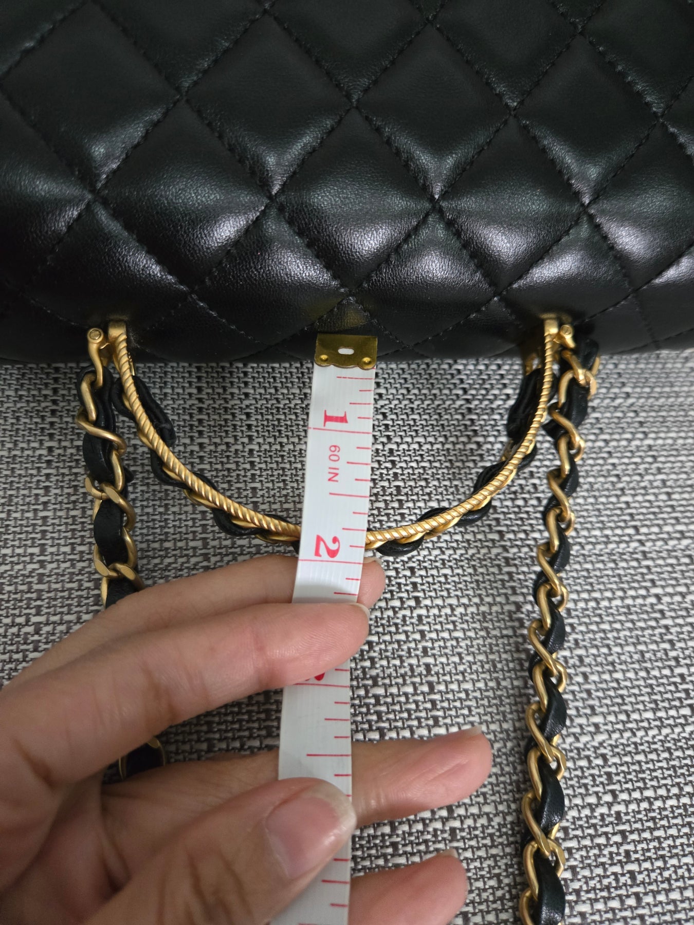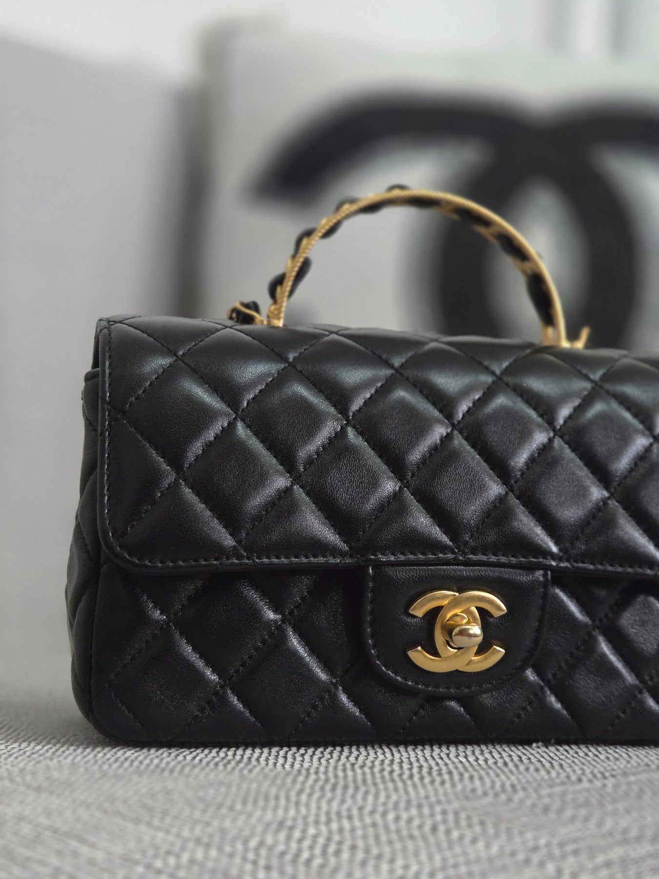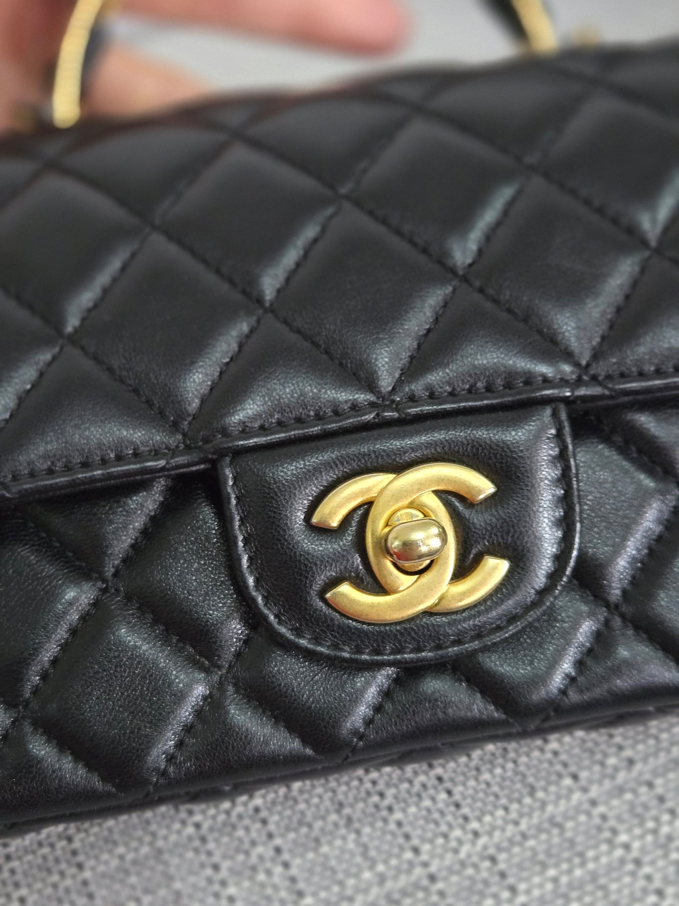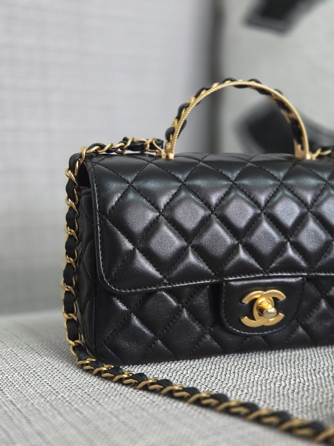 Chanel 2023 Black Lambskin GHW Brassed Metal Top Handle Mini Rectangular Flap Bag