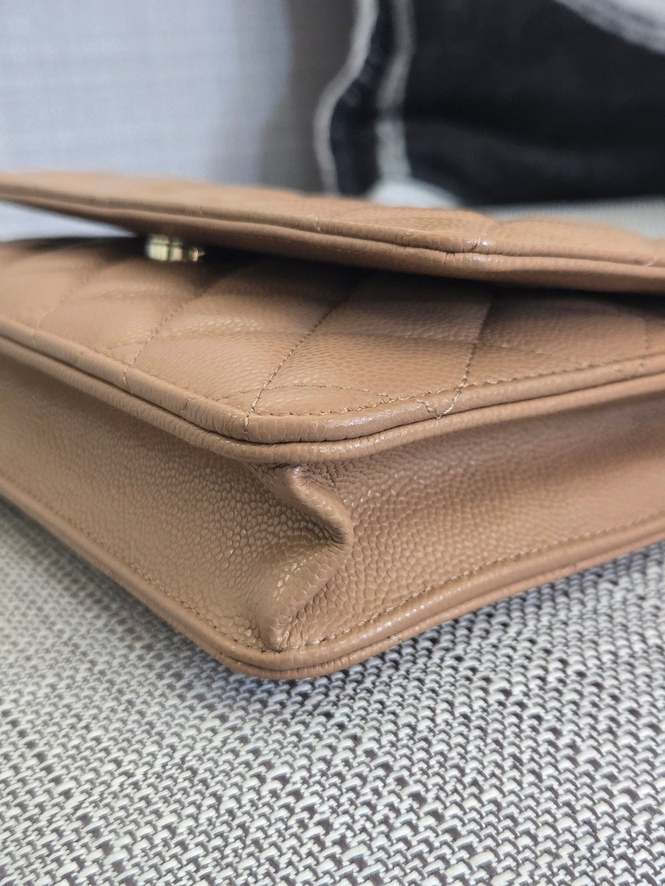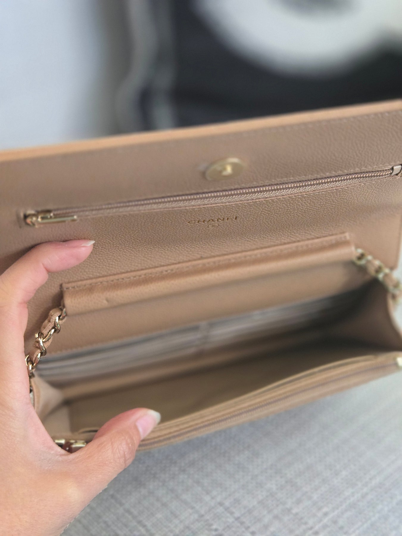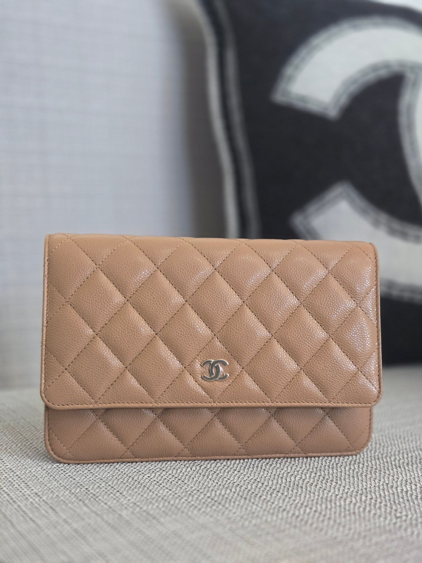 Chanel Dark Beige Caviar Champagne GHW Classic Wallet on Chain (WOC) 2023