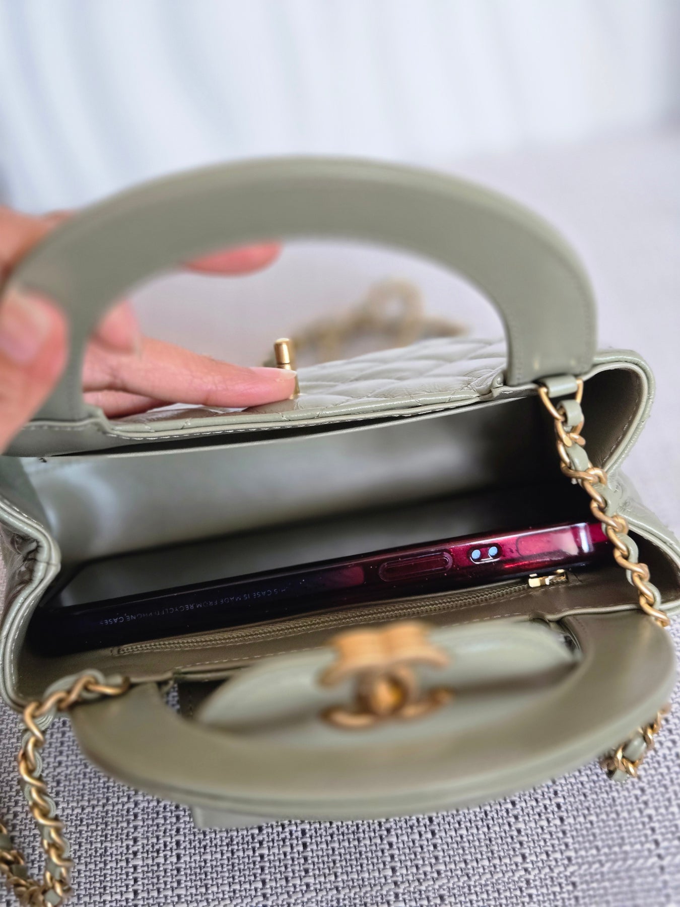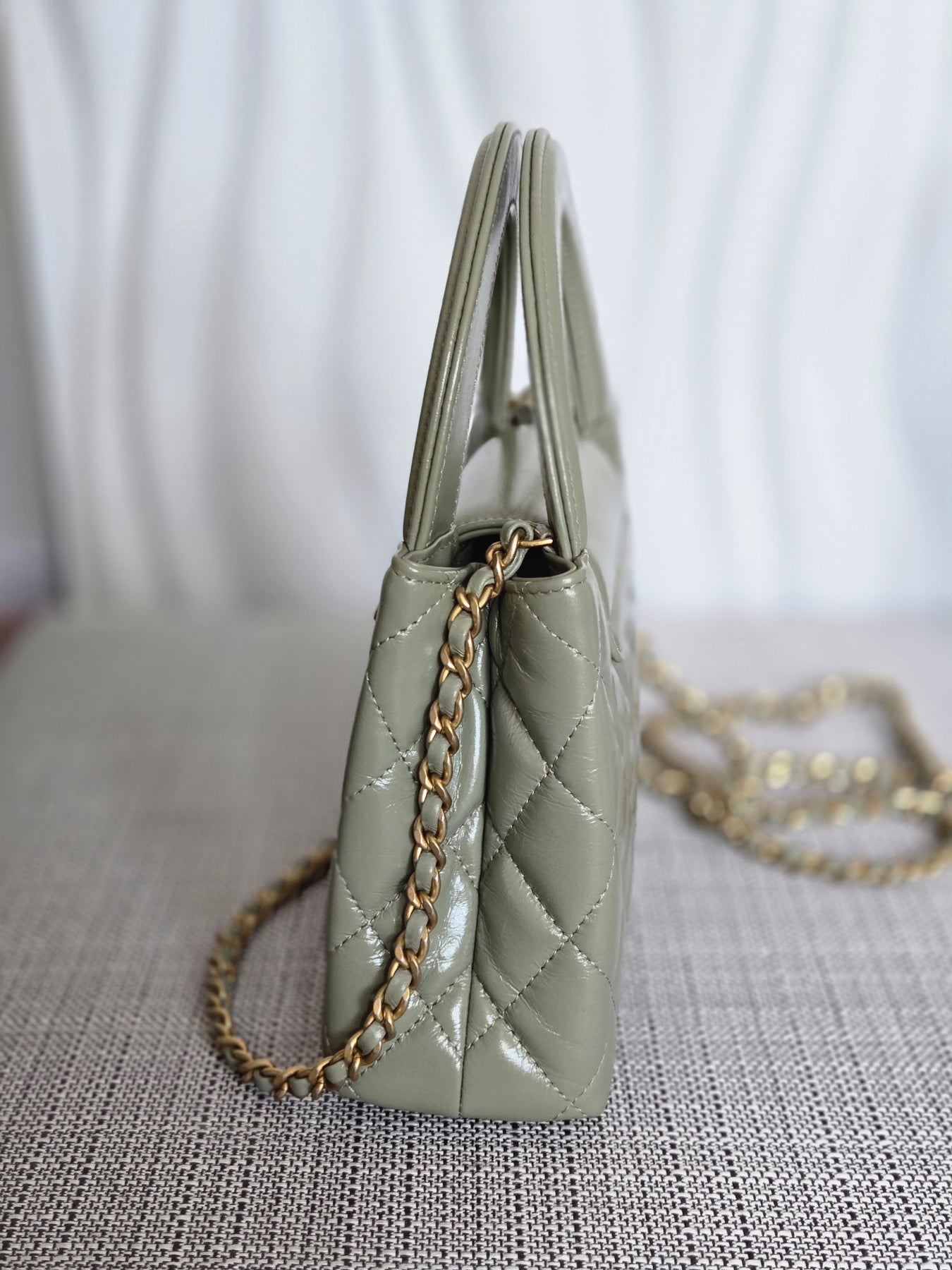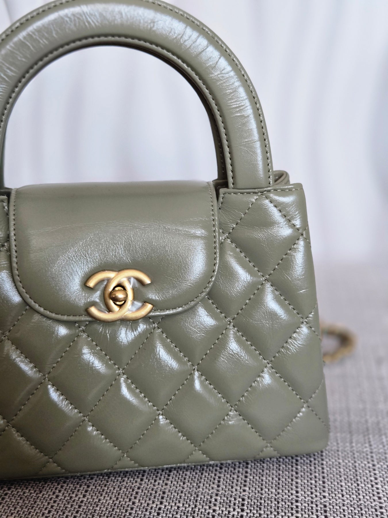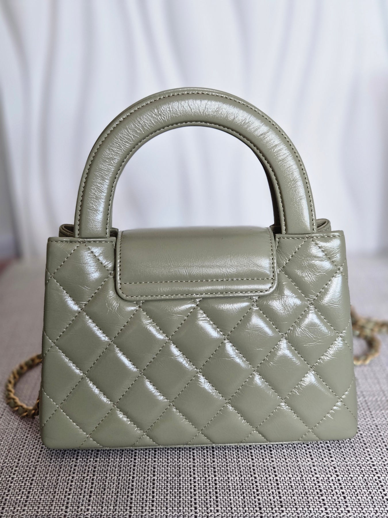 CHANEL Sage Khaki Green Glazed Calfskin Aged GHW Nano Kelly Shopping Bag size Small (19cms)
