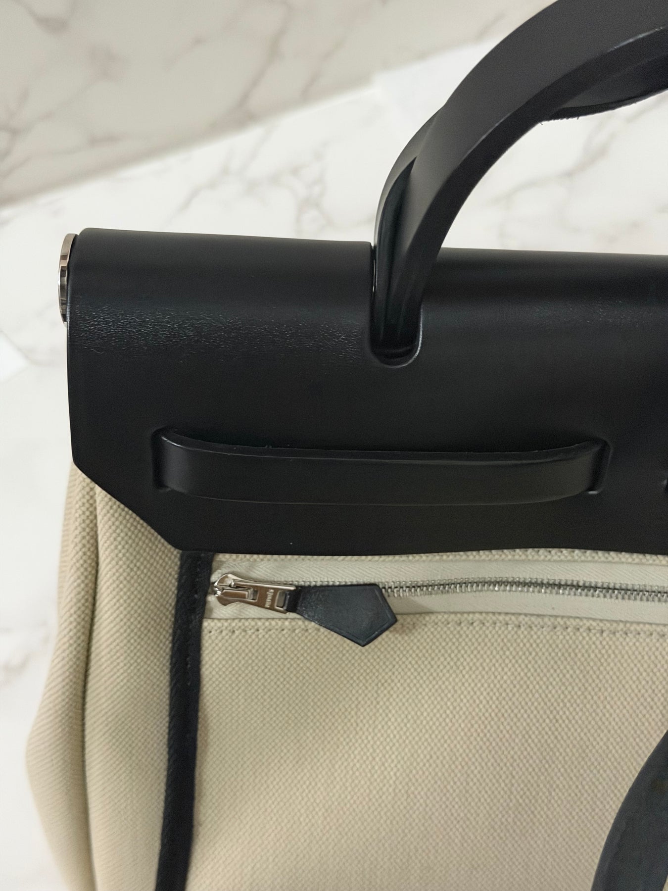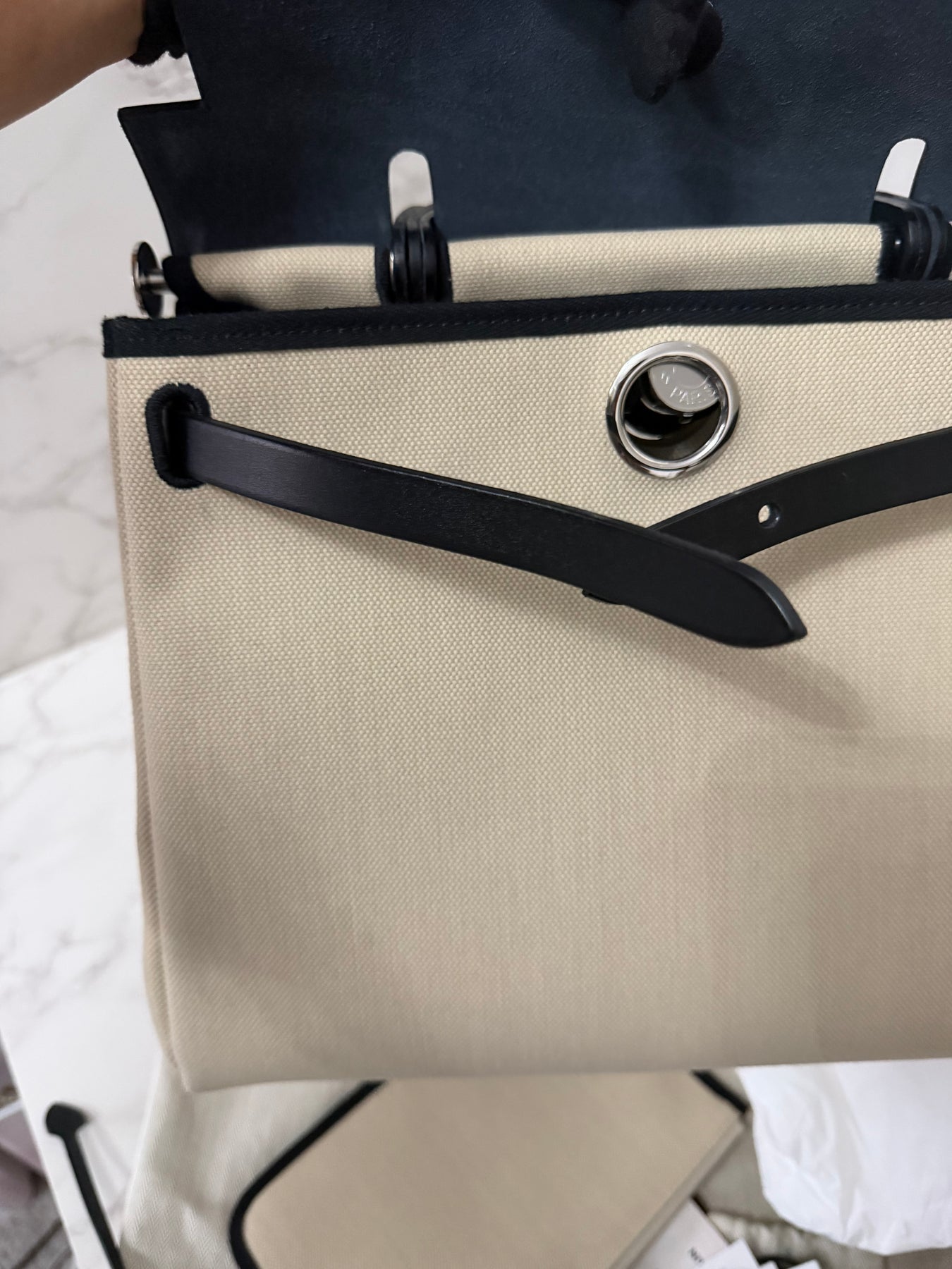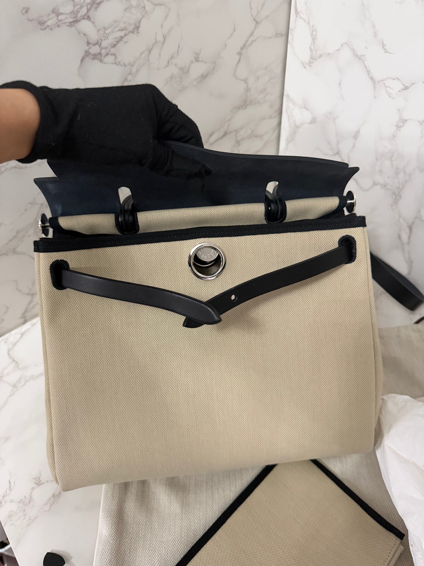Hermes Herbag Zip 31 Bag in Beton Canvas/Noir Black Leather Palladium Hardware