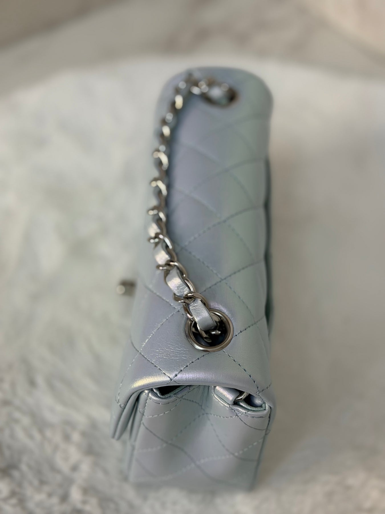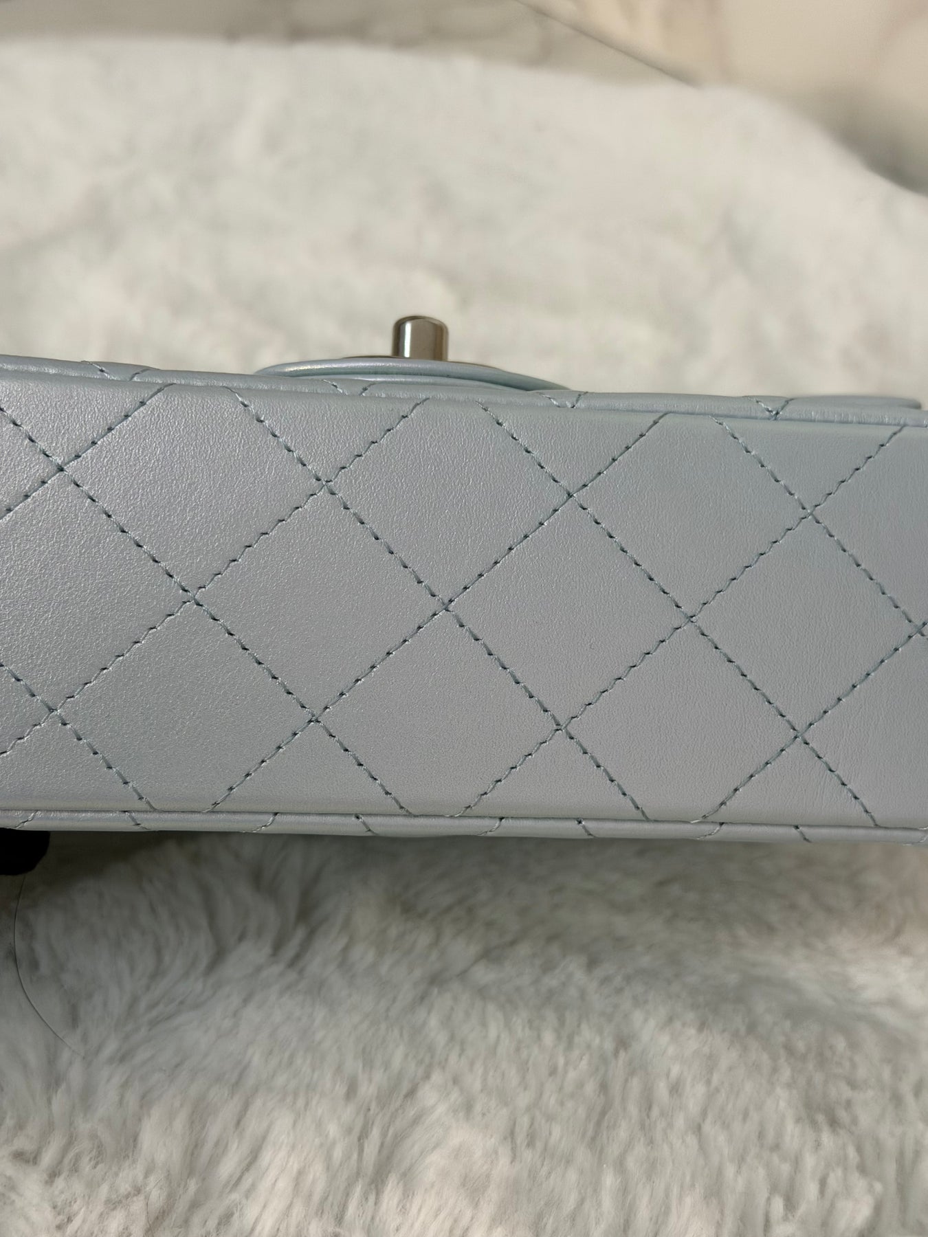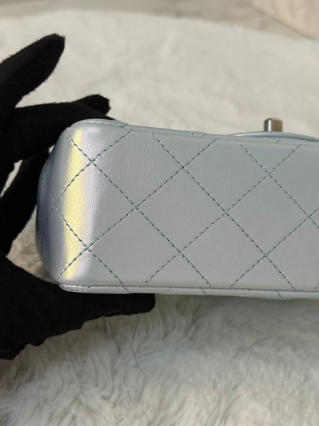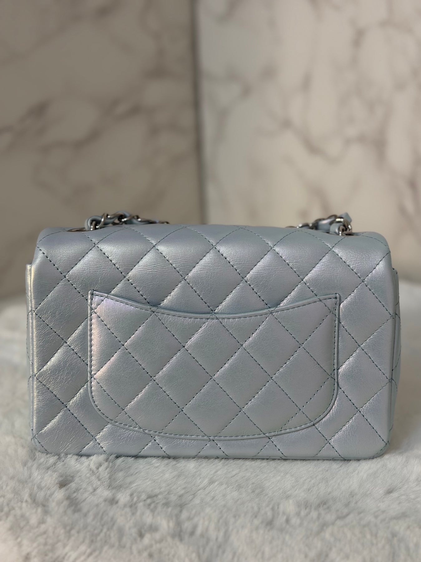 CHANEL 21K 2021 Iridescent light Blue Calf skin SHW Mini rectangular flap bag microchip