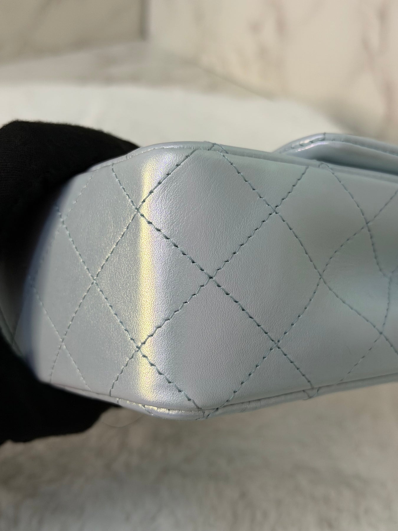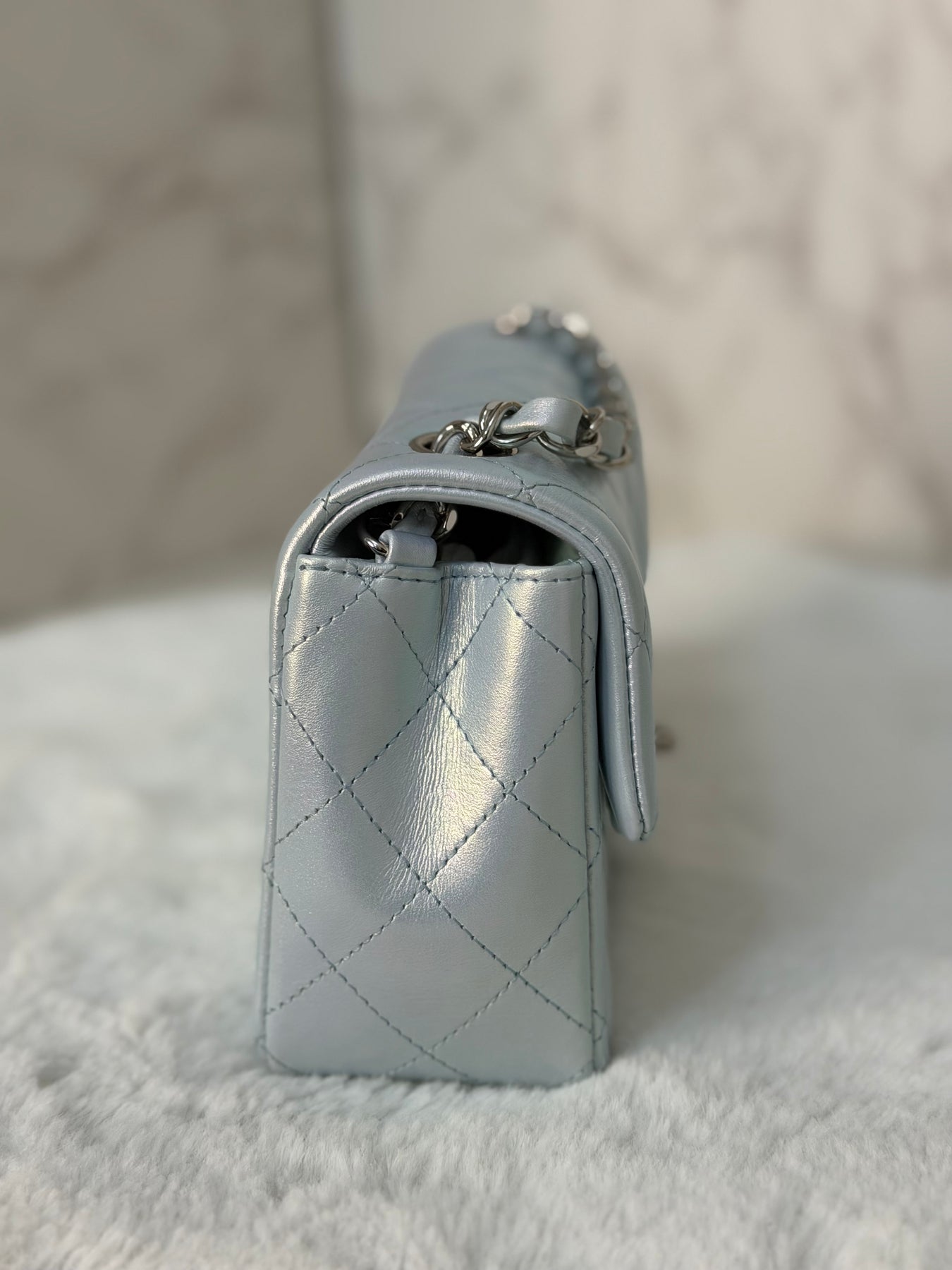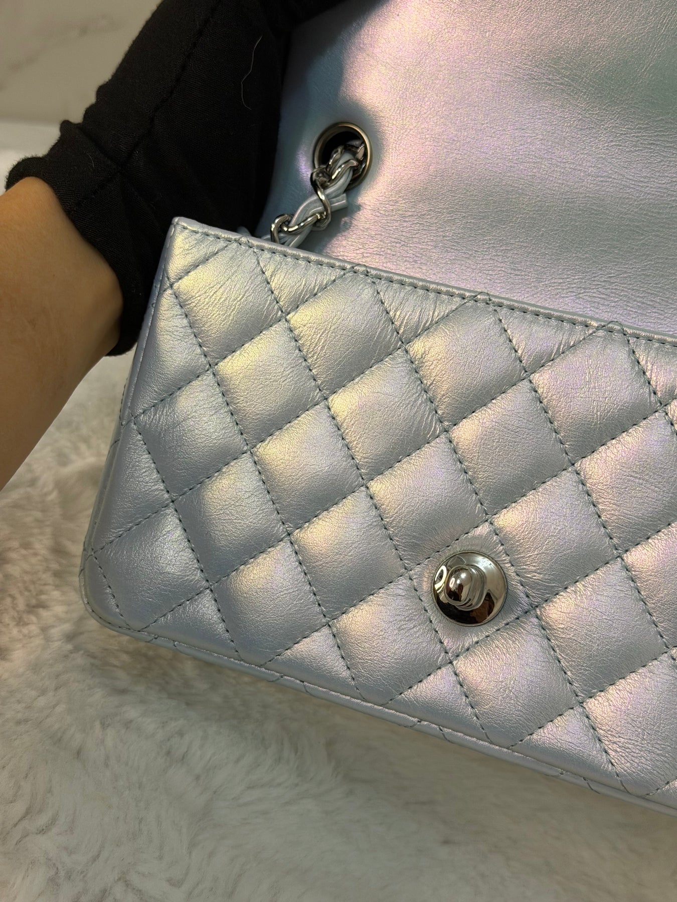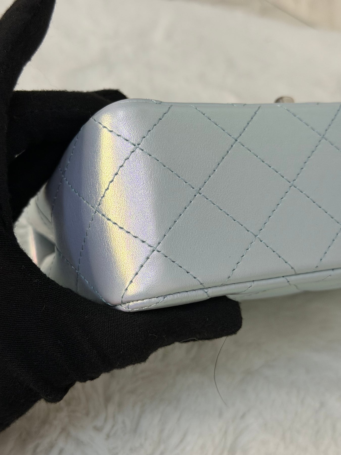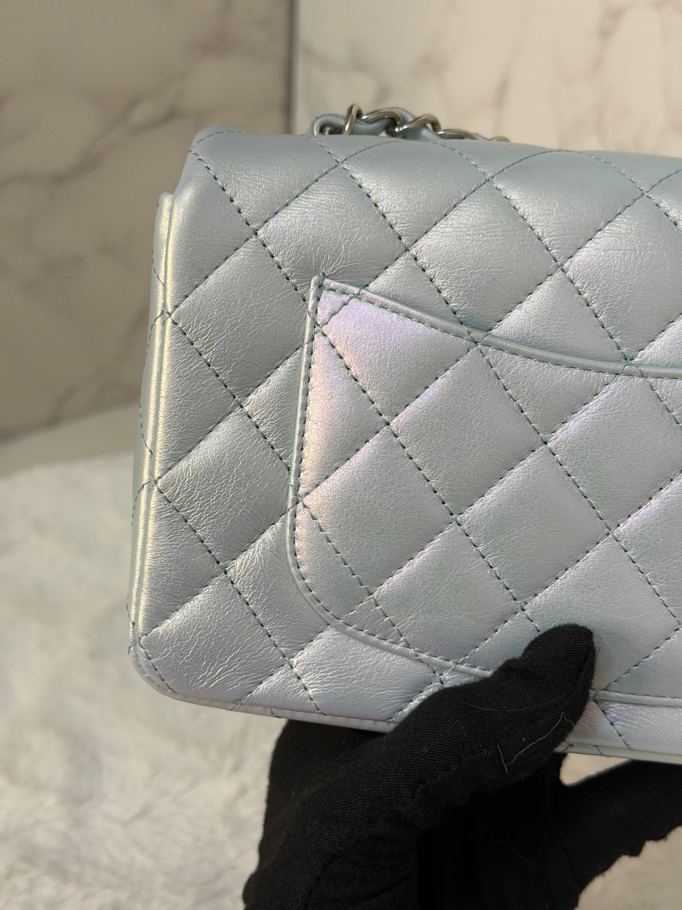 CHANEL 21K 2021 Iridescent light Blue Calf skin SHW Mini rectangular flap bag microchip