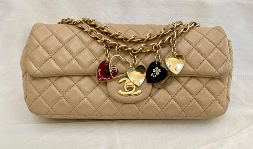 CHANEL Beige Lambskin Valentine East West Flap Bag series 13 with Charms