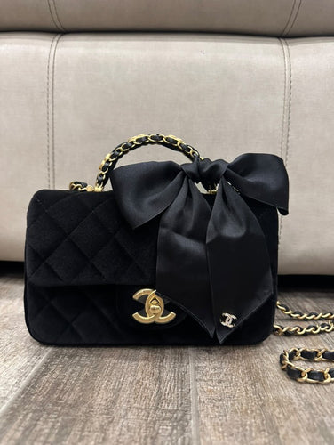 CHANEL 25K Collection 2025 Black Velvet Bow LGHW Mini Rectangular Flap Bag with Metal Top Handle